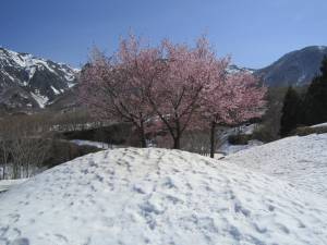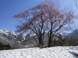 ぽかぽかの春陽気、巻機山麓の、桜坂付近の大山桜が咲き始めました。見ごろは連休中ごろだと、思います。雪の中に堂々と咲いています。色も鮮やかで、大切にしたい名木です。