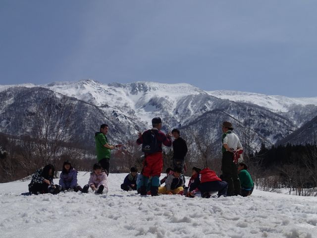 前半は絶好の晴れとなり、雪の上の山歩きとソリ滑りなどを楽しみ、夜も雪灯ろうづくりなどで雪国ならではの時間を過ごしました。
