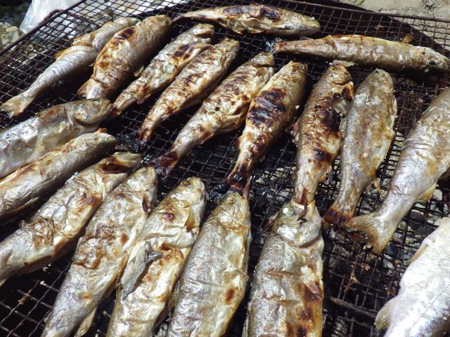 体を動かした後は区役員が準備してくれたニジマスの塩焼き、鯉の味噌汁、焼きそばを食べながら、帰省した同級生や家族と近況や思い出話に花を咲かせていました。