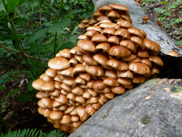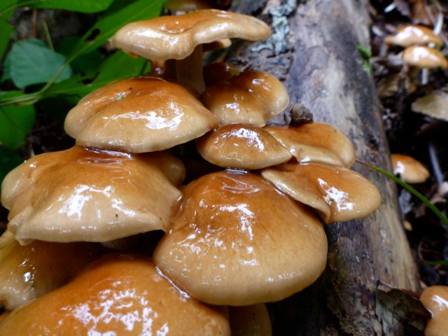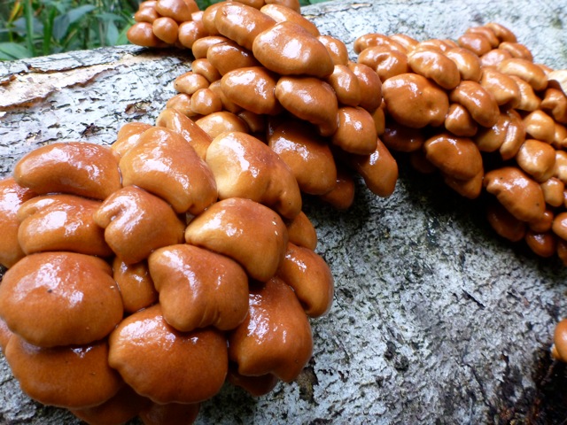 この時期には珍しく、1本の原木にしっかり色づいたナメコが顔を出していた。